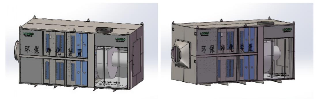 噴漆廢氣高效凈化一體機包含:過濾模塊、光催化氧化模塊、活性炭吸附模塊、風機,示意圖如下: